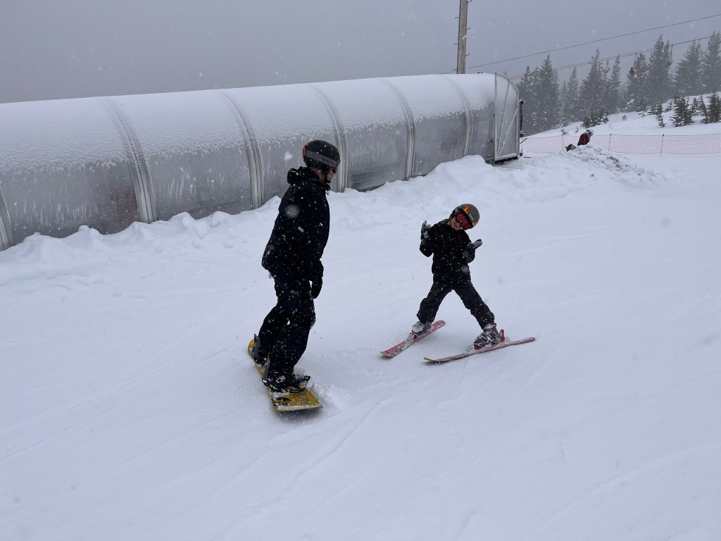 We went on a great skiing adventure last Saturday! Rowan and a friend took off on their own and headed up the mountain, Murphy headed to 2 hours of ski school, I headed up on the lower slopes to get a couple runs in before the 2 hours of ski school were over, and Jesse kept our friend and his 10-month-old company in the lodge. Don’t worry, Jesse got to snowboard in the afternoon.