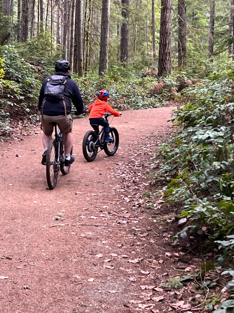 We took our new mountain bikes out to the trees today. As someone who hasn’t gotten a new bike in many, many years, I was ecstatic! Our 7-year-old just got a new (on sale at REI) 20 inch mountain bike. My husband’s bike is a couple years old. Murphy started off timid, but was heard yelling, “Coming in hot!” later in the day. As always, it was an adventure!!!